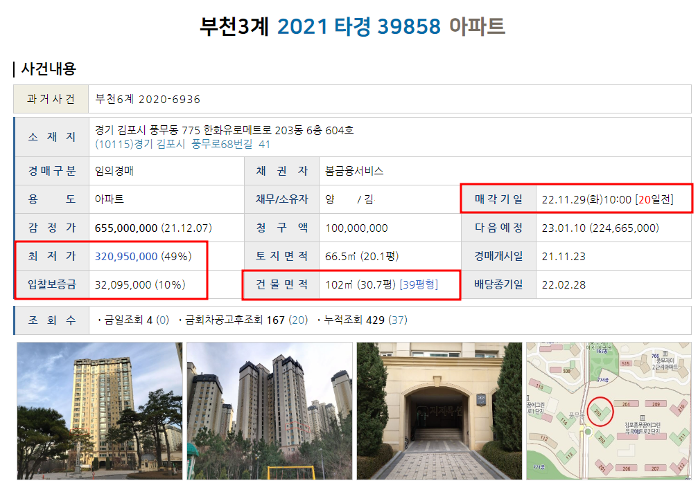 2회 유찰되어 감정가 대비 49%로 진행되는 김포시 풍무동에 위치한 한화유로케트로 39평형이 경매로 매각됩니다. 이지역 인근 아파트 매매로 찾고계셨다면 이번기회 경매로 취득해보시기 바랍니다.