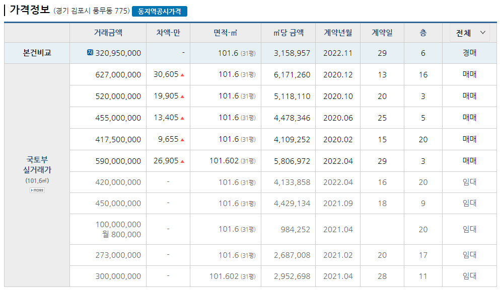 아래 보시듯 최근 거래사래 2022.04월 3층 59,000 확인 됩니다. kb국민은행 시세 평균가 60,500 으로 보이며 전세 40,000대 입니다. 현재 호가만 매물이 나와 있는상태인데 매매가 전무한 상태로 이번 2회 유찰된 각격은 상당히 메리트 있어 보입니다. 시세를 고려해 저렴하게 취득 가능해보입니다.